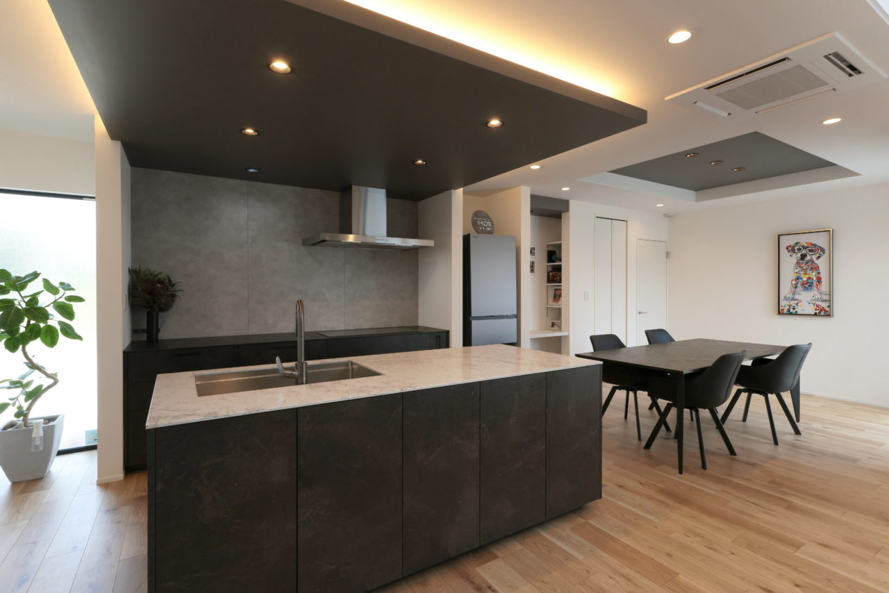 アクセントでブラックのキッチンを使用したデザインになっております😛