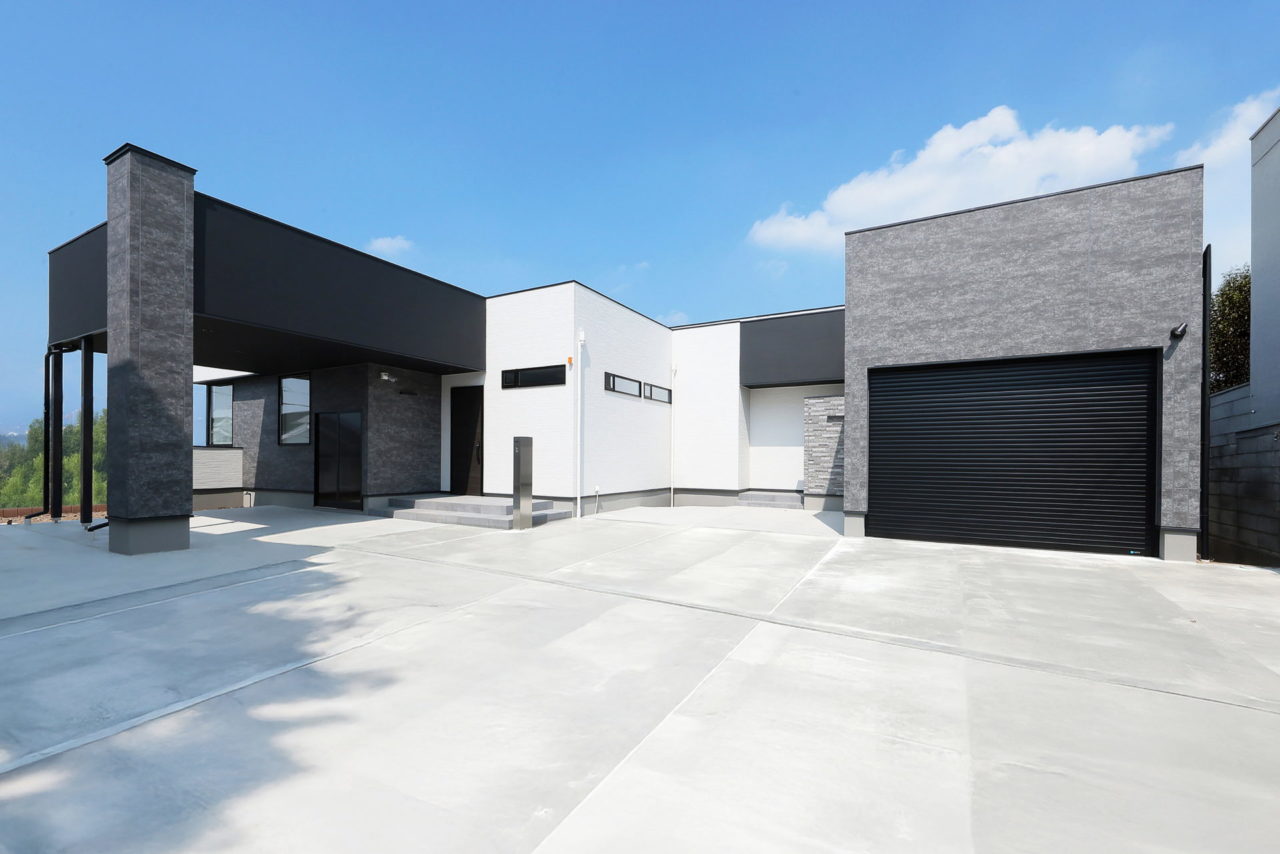 オープンガレージと電動シャッター付きガレージが一際目立つ