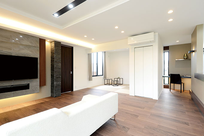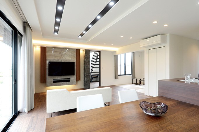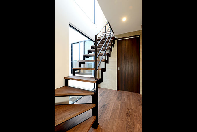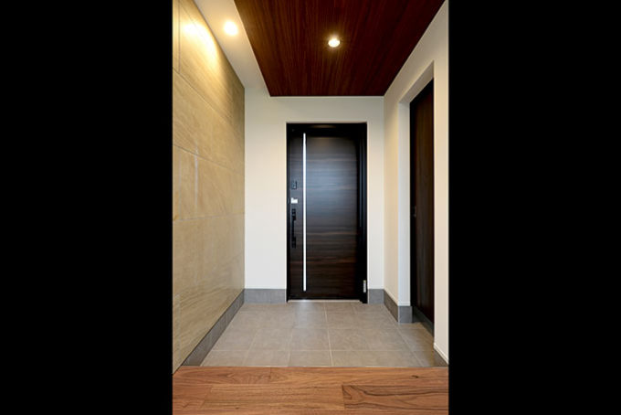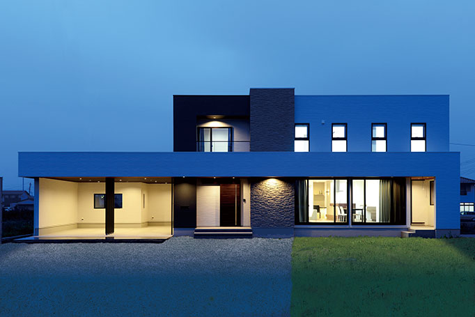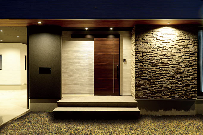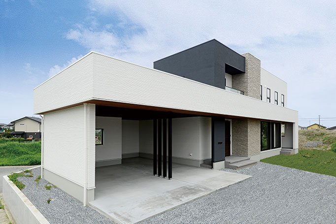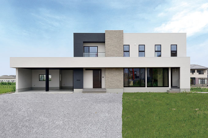 大迫力の外観、デザイン。スパイスとして、ブラックや凹凸感のある石張りが組み込まれることにより、デザイン、奥行きが生まれた。