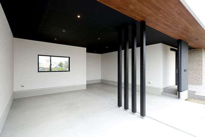 車2台分のカーポートガレージ。天井デザインのレッドシダーとブラックのコントラストが良く仕上がった。奥はタイヤ置きスペースとして。