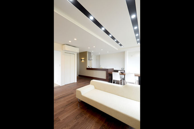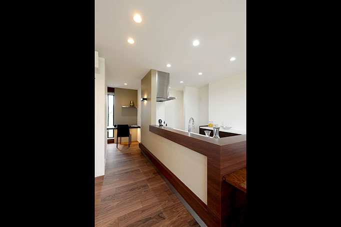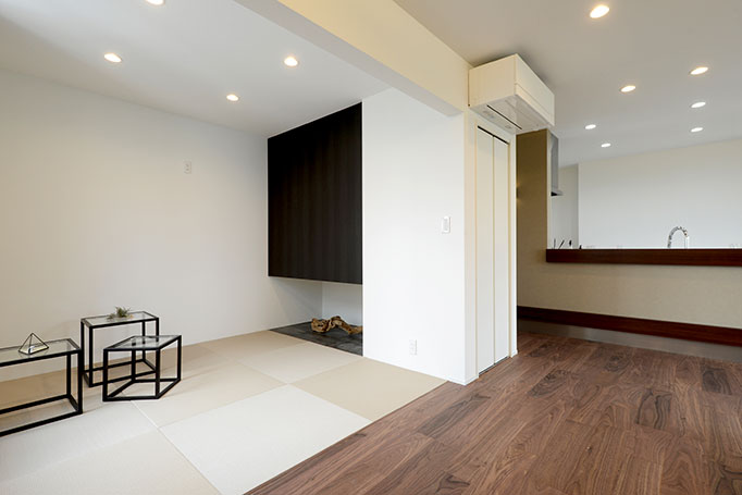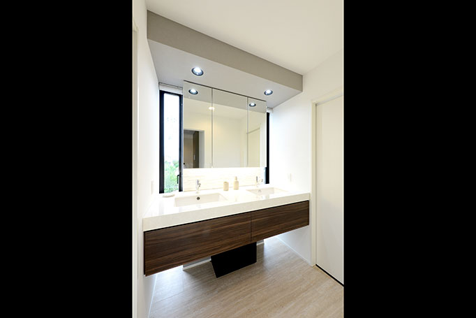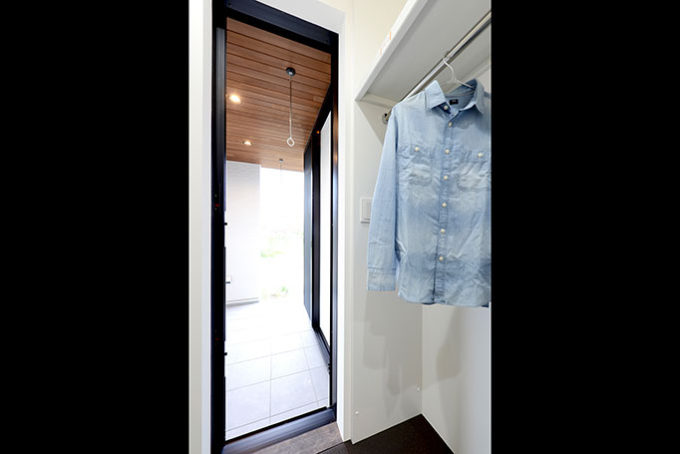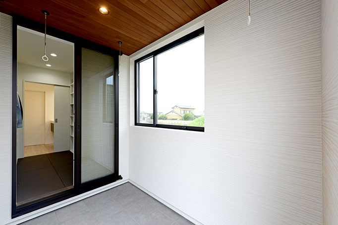 ランドリールーム→室内干し兼1F WICへと繋がる半外のデッキスペース。外干しでも雨に濡れず干すことが出来、ストレスフリーな家事動線も意識した配置となった。