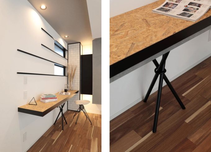 リビング横に設けられたユーティリティーカウンター、リビングのオブジェ的存在にも感じるSIBUSAWAオリジナル造作家具が、空間の価値観をさりげなく上げている。また、OSBの天板にブラックやコンクリートグレーを合わせ、視界的背景にホワイトタイルを合わせることも、細かな計算に基づいたコーデである。